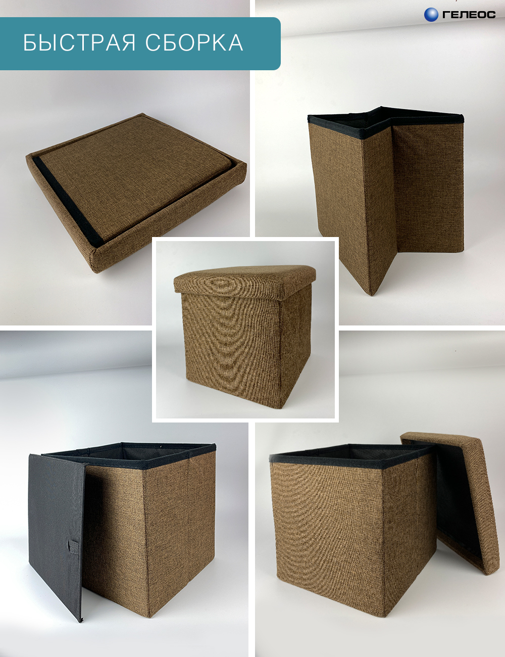 Пуфик складной из плотного материала с вместительным ящиком для хранения. Каркас изготовлен из прессованной ДВП, тканевая обивка из мебельной рогожки. Крышка с мягким наполнителем. Пуфик с большой функциональностью, подойдёт для комнаты, для коридора, в гардеробную, в спальню, как банкетка в прихожую, подставка для ног, недорогая мебель для дачи, добавит уют вашему дому. Простая сборка и чистка от загрязнений. Хорошо выдерживает нагрузки. Пуфик банкетка лёгкий для переноски. В нем можно хранить одежду, обувь, игрушки, бельё, предметы хобби. В серии ГЕЛЕОС Пуф возможно комбинировать пуфы разного размера и цвета.