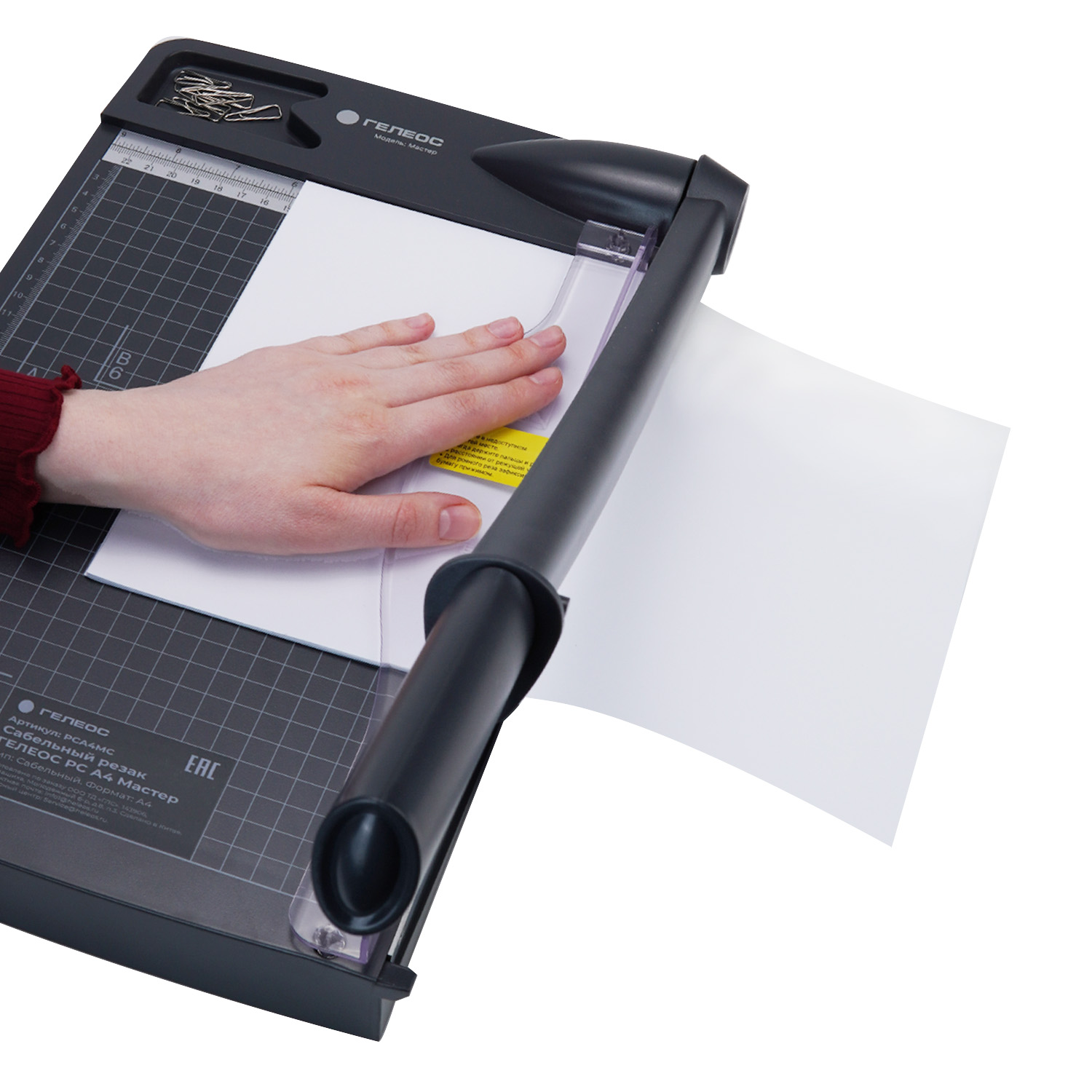 Главная—Каталог—Резаки для бумаги—Резак сабельный ГЕЛЕОС РС A4 Мастер для формата A4 и разрезания стопы из 18 листов
